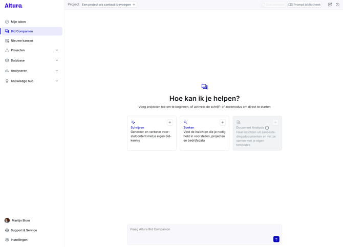 - Als je de Bid Companion hebt geopend vanuit de linker zijbalk van Altura, moet je hier nog een project voor selecteren. Je kunt dit doen door op de knop "Een project als context toevoegen" te klikken, je kunt dan het desbetreffende project selecteren. Als dat gedaan is, kun je op de documentenknop klikken.