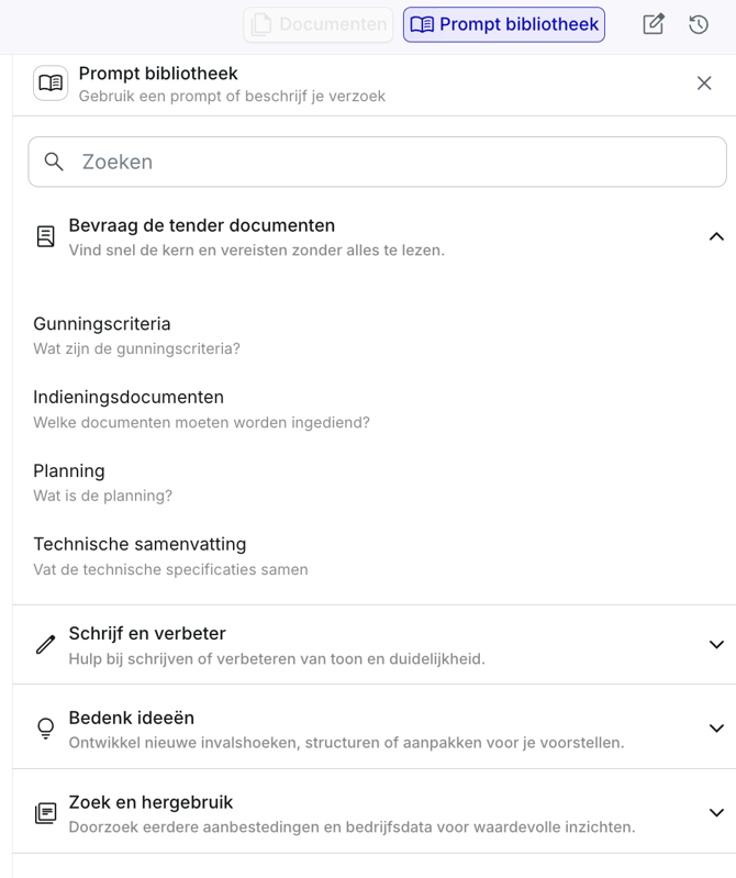 Weet je niet zo goed wat je kunt vragen? Je kunt hier de Prompt Bibliotheek voor gebruiken, een set met prompts, samengesteld om je te helpen bij het gebruik van de Bid Companion.