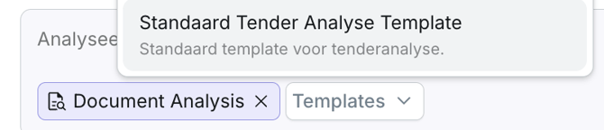 Nadat je de bestanden hebt geselecteerd, kies je een template dat past bij waar je naar op zoek bent. Je kunt deze template selecteren door op de knop Document Analysis te klikken. Dan verschijnt er een knop "Templates" in de chatbalk met alle verschillende templates die je tot je beschikking hebt.