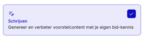 Met de Schrijven Modus in de Bid Companion kun je tekst laten genereren voor je voorstellen. De functie is bedoeld om sneller tot een eerste concepttekst te komen, op basis van de documenten die je als context toevoegt.